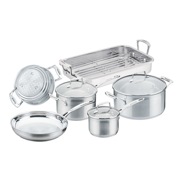 With many years of experience, SCANPAN's Danish designers have developed the popular stainless steel Impact range with all the features you would expect from SCANPAN. This set features a stylish two tone matt/polished appearance and includes a 16/1.8L saucepan, 20cm/3.5L saucepan, 24cm/4.8L dutch oven, 26cm fry pan, 16/20/24cm universal steamer, and 42 x 24 x 6cm roaster with rack. The optimal 6.4mm thick bonded sandwich base ensures optimal heat distribution. Compatible with all energy sources including induction. The rim design allows for drip-free pouring and the handles are secured with stainless steel rivets. The contemporary satin finish will suit all kitchen decor. A very popular range offering great value for your money!