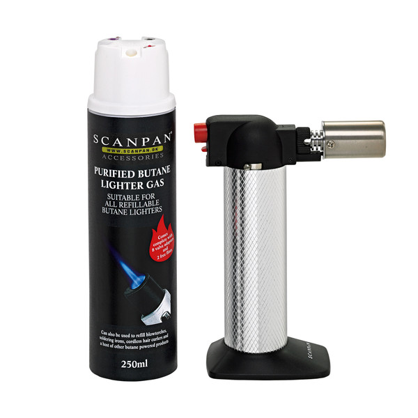 The SCANPAN Professional Chef's Torch adds the finishing touch to your culinary creations. Ideal for browning meringues, caramelising sugar, flaming desserts, crisping joints of meat, skinning tomatoes and general food styling.